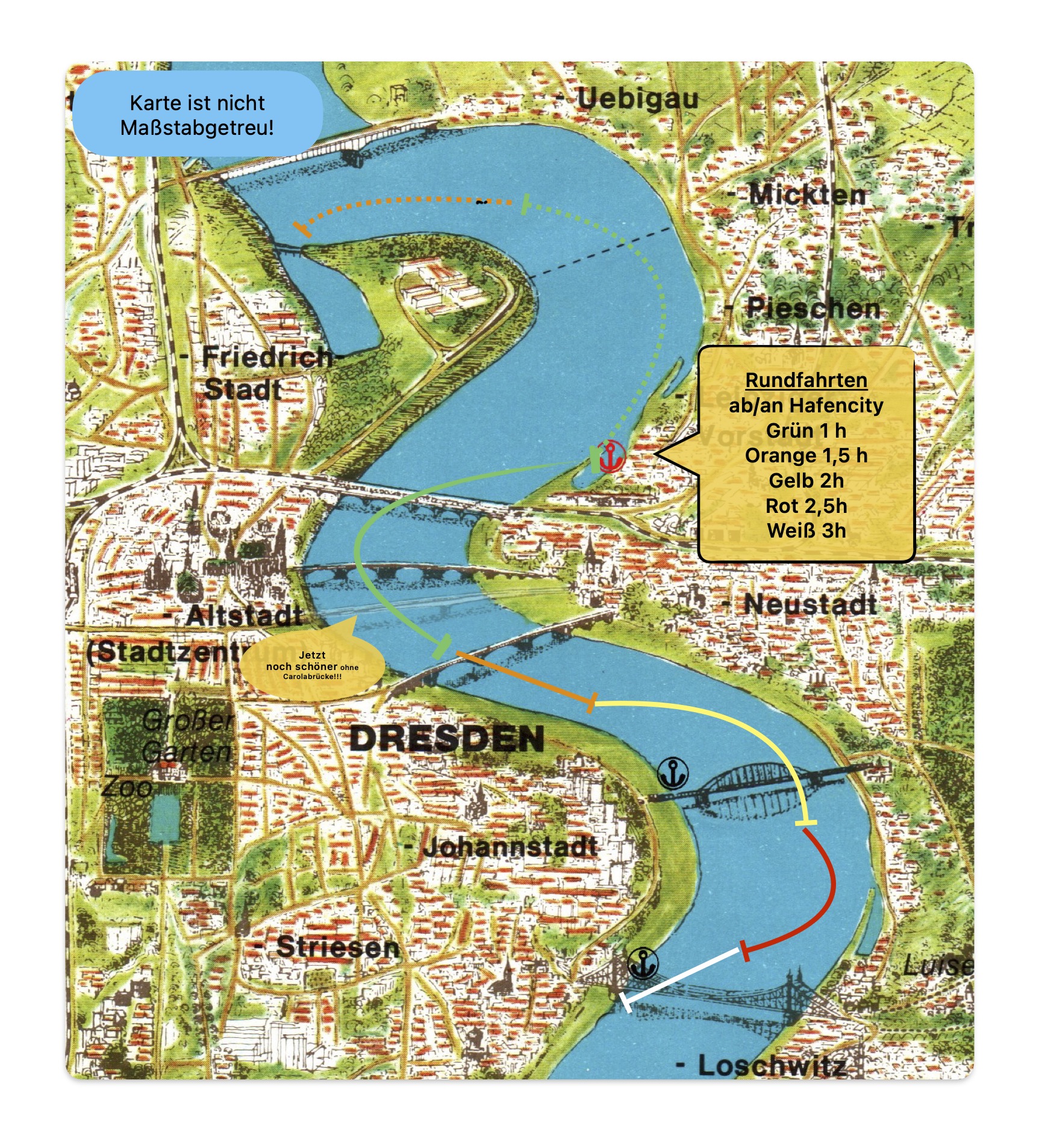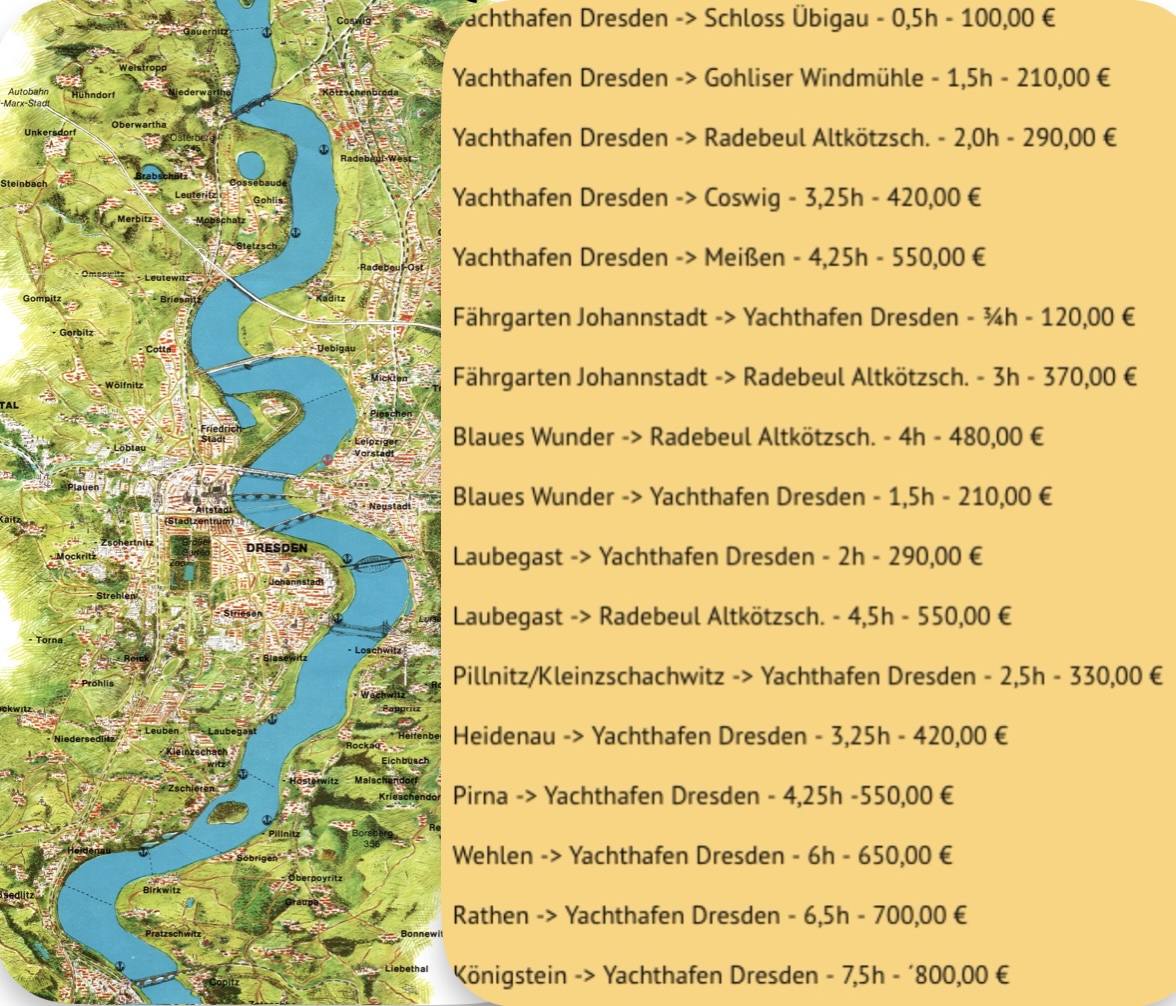Die Floß-Boote werden von einem Guide gesteuert und können an vielen Stellen entlang der Elbe anlegen. Unser Fahrbereich ist ähnlich dem der sächsischen Dampfschifffahrt.