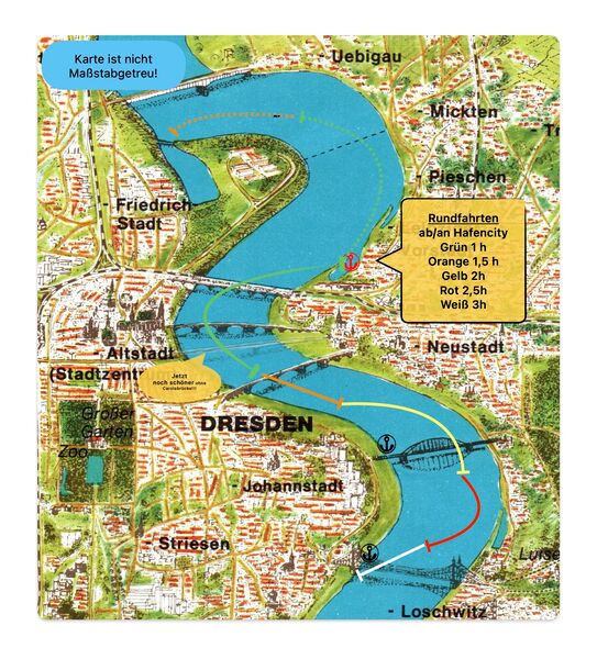 Die Rundfahrten beginnen und enden normalerweise am Hafen Dresden Neustadt .Die Karte ist nicht maßstabsgetreu.